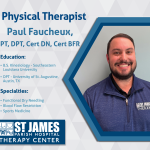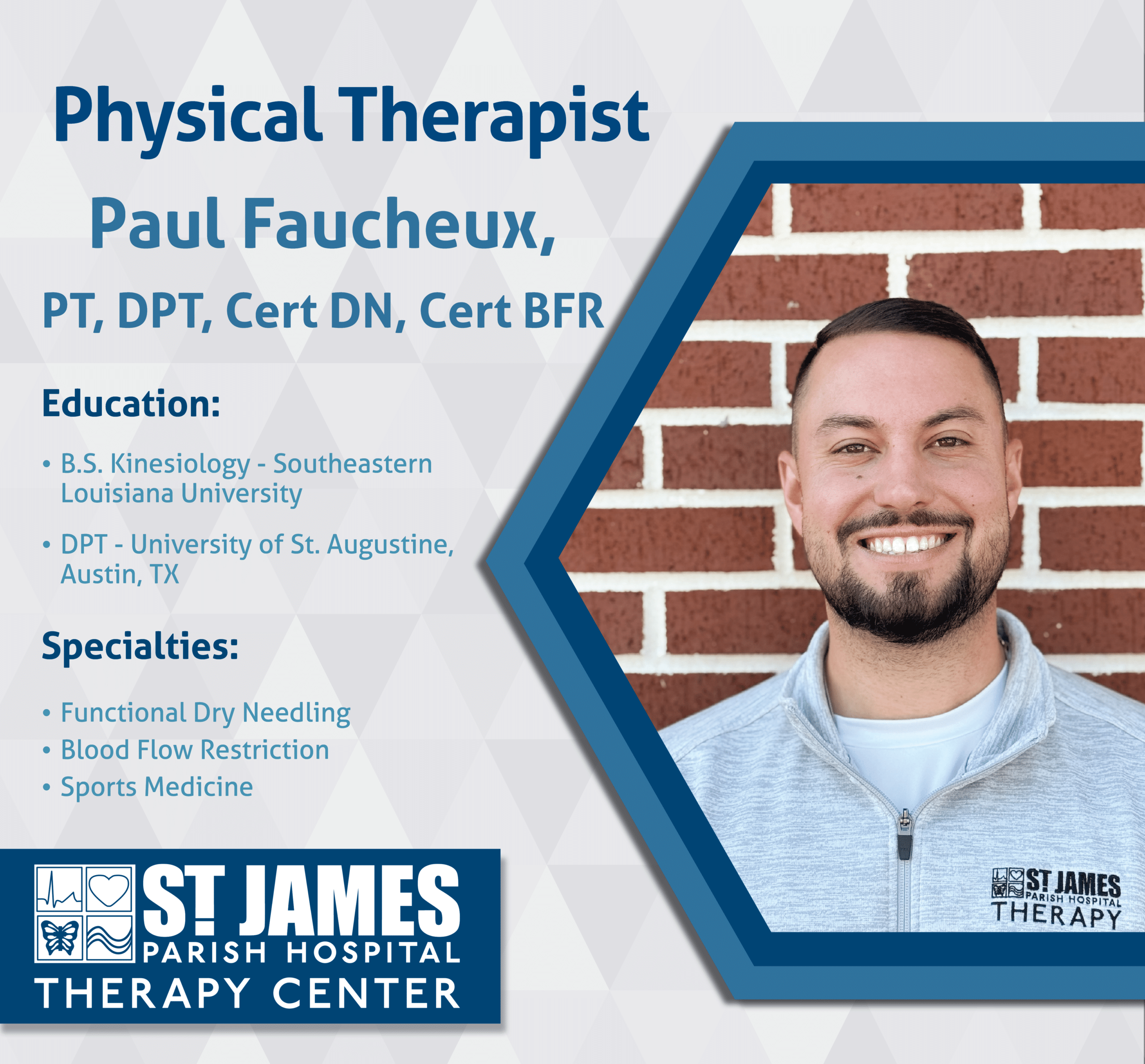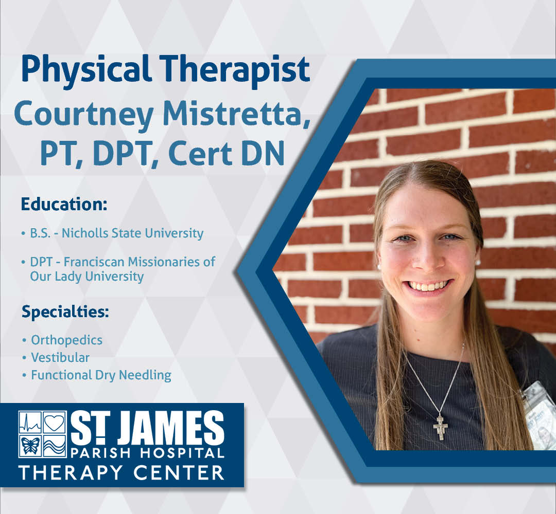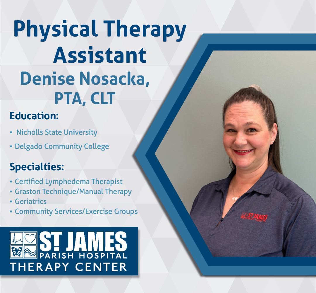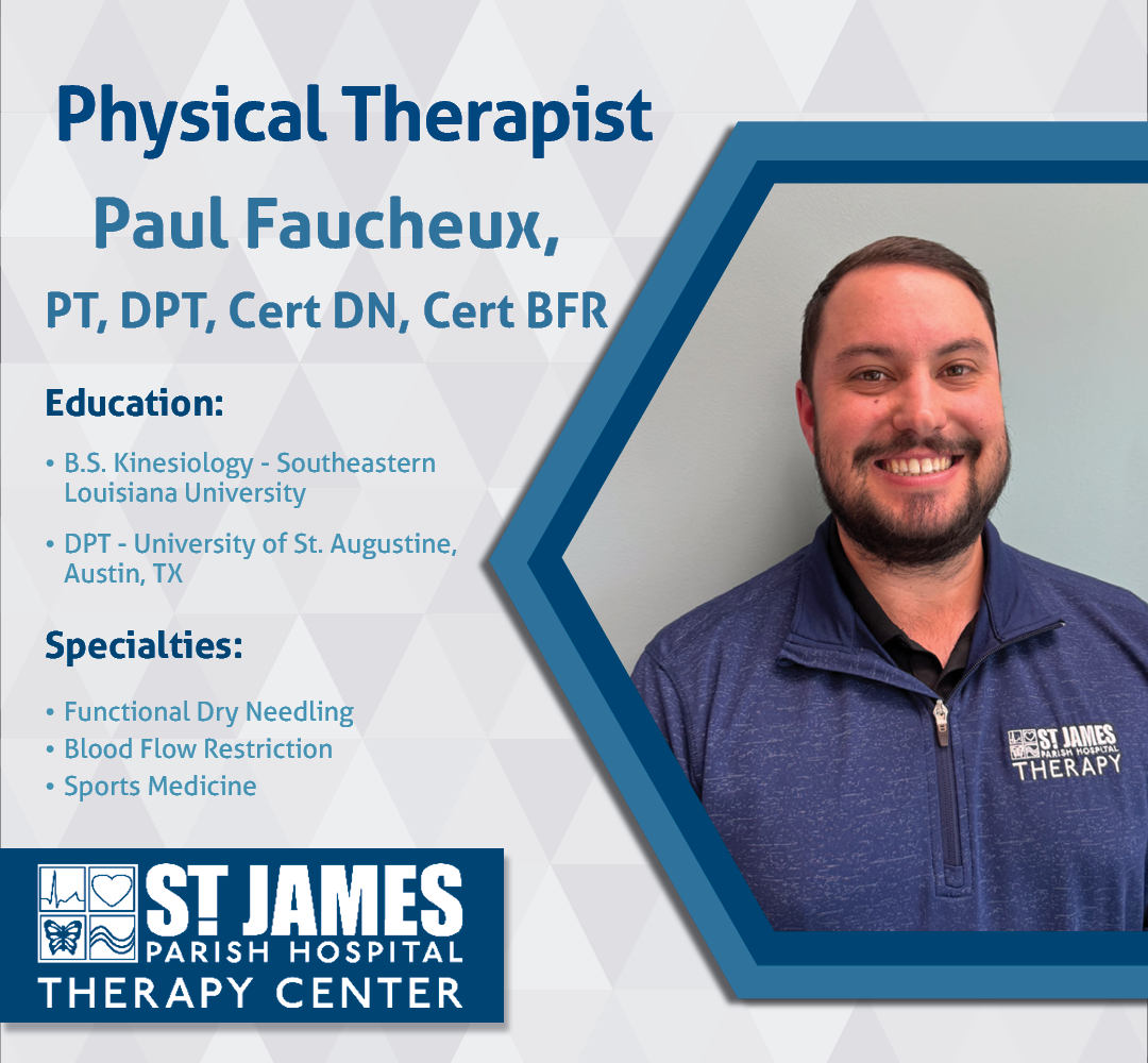 At St. James Parish Hospital, we are proud to employ a team of licensed physical therapy professionals dedicated to helping patients recover, regain mobility, and improve their quality of life. Our therapists bring clinical expertise, compassion, and personalized care to every treatment plan. We believe that exceptional care starts with a commitment to continuous learning. That’s why we actively invest in our physical therapy team by supporting their pursuit of advanced certifications and specialized training. This ongoing professional development ensures our therapists stay at the forefront of the latest techniques and best practices, delivering the highest level of care tailored to each patient’s unique needs.